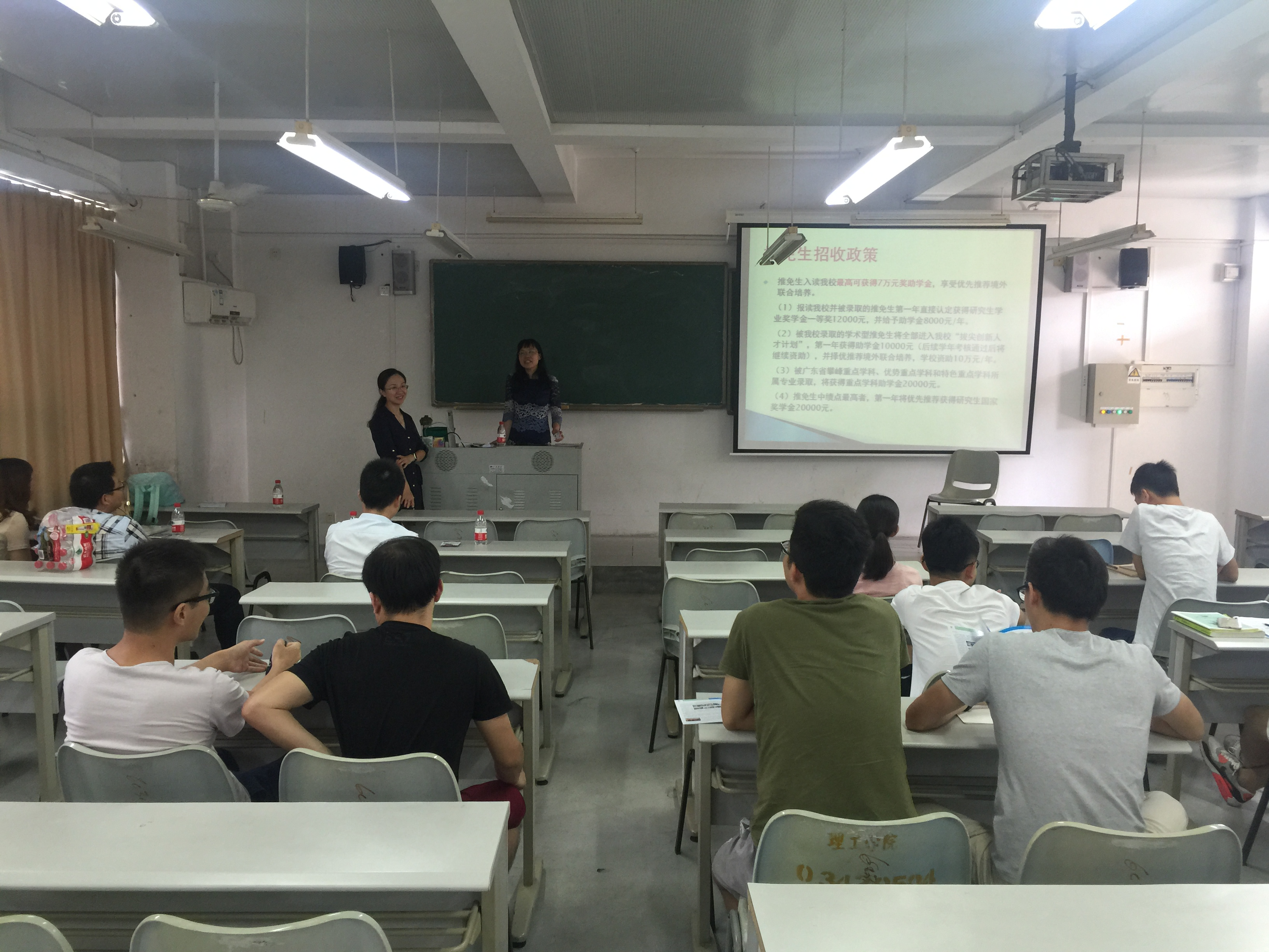 2017年9月26日上午10点,广东工业大学轻工化工黑料吃瓜网 院长助理郑育英教授和研究生办公室马巍老师在我校研究生办公室工作人员陪同下,来到教学楼6C302为黑料吃瓜网 的考研学子展开招生宣讲。