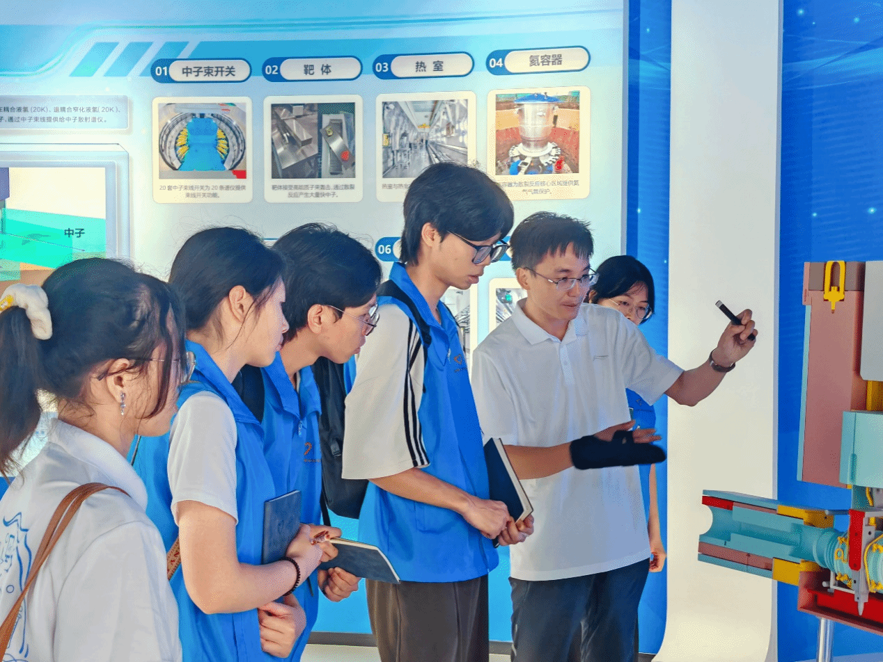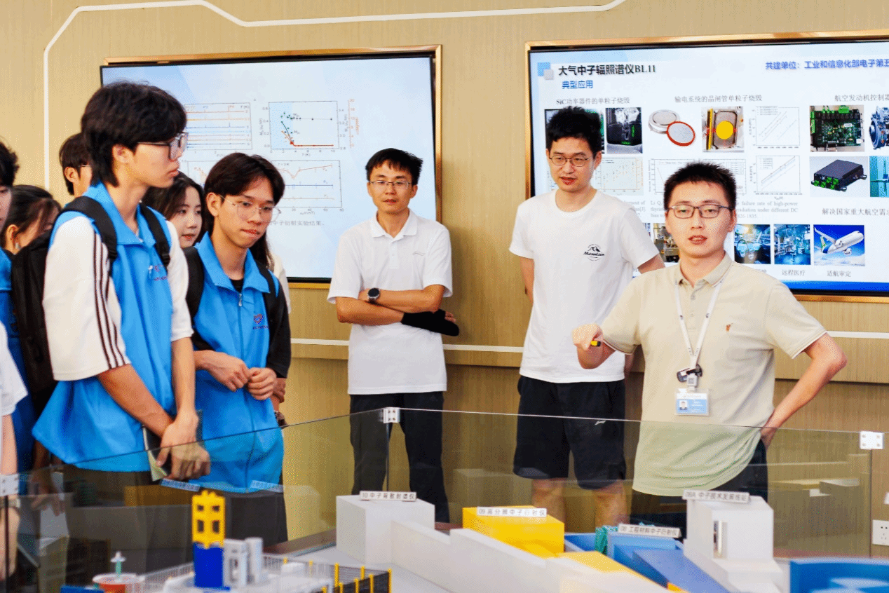高能物理所的发展历程、设备组成及科研成就,通过对大型实验装置、探测器和加速器等的介绍,让同学们感受到高能物理研究所在科技领域的前沿技术及辉煌成就。科普展厅全面展示人类探索微观世界奥秘的意义,以及大科学装置的运行原理。师生近距离参观了直线加速器、快循环同步加速器、靶站谱仪等科学设施。