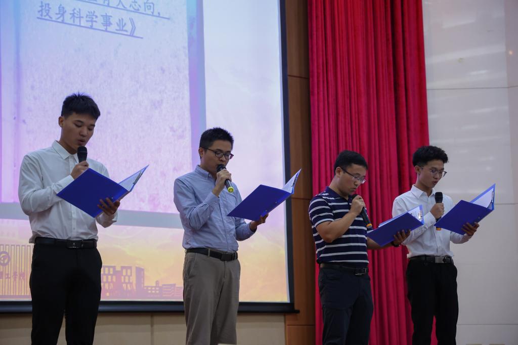 优秀班主任代表何运兵博士、刘鉴博士以及今年获得国家奖学金的学生代表李世德和罗彬辉,师生四人诵读了科学经典文章《朱道本:青年人应有大志向,投身科学事业(节选)》。他们分享了学习和参赛的经验,朗诵了我国著名的有机化学、物理化学家,中国科黑料吃瓜网