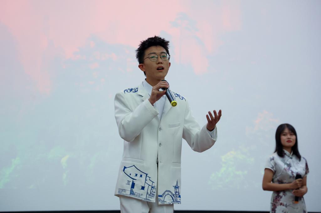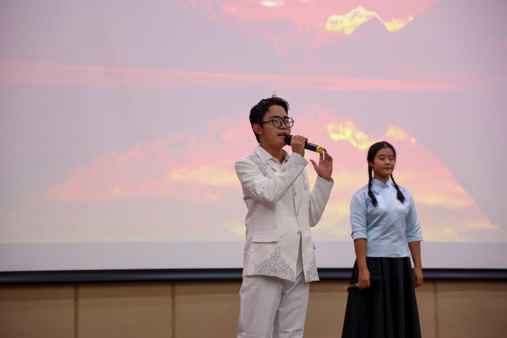 “一件件大国重器的成功研制,撑起了中华民族伟大复兴的坚强脊梁!”罗舒雯、叶小亚、陈子豪等八名学生代表表演了朗诵节目《干惊天动地事、做隐姓埋名人》。一句句慷慨激昂的朗诵词,道出我们万千学子对科学家的敬仰之意!