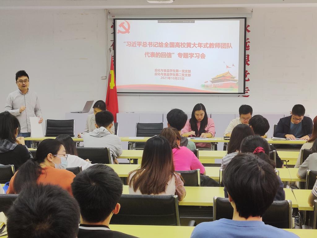 10月25日下午13点,应化与食品学生第一党支部与应化食品学生第二党支部在12L102联合开展“习近平总书记给全国高校黄大年式教师团队代表的回信”专题学习党日活动。第一支部书记张博、第二支部书记刘哲、以及两个支部委员陈思谦、王波、朝洁和全体学生党员参加了会议。