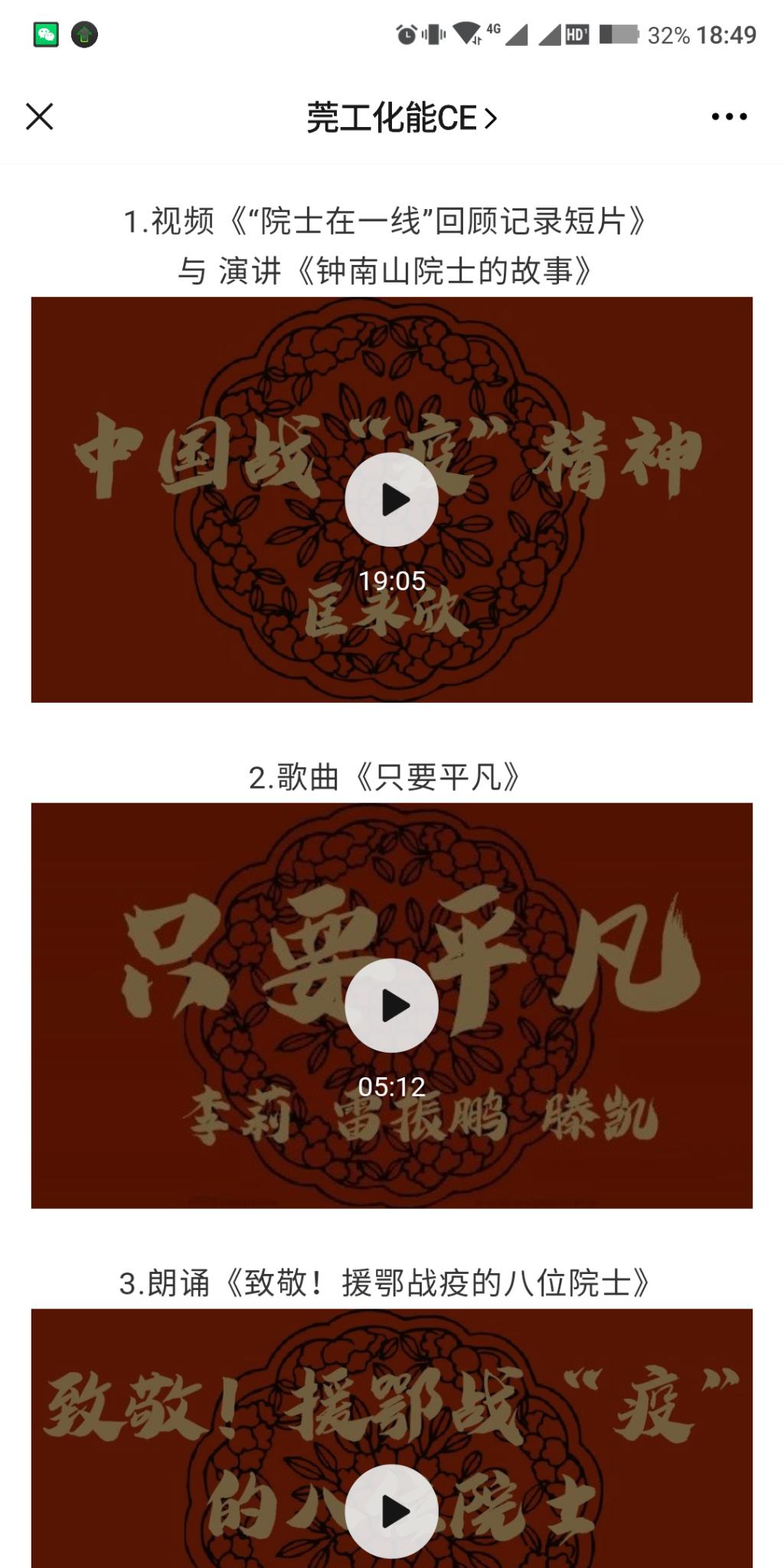 活动在视频《“院士在一线”回顾记录短片》的播放中开幕,匡永欣等三位同学讲述了《钟南山院士的故事》,再现了钟南山院士对百姓生命健康高度负责、心怀家国大义的时代英雄形象;李莉、滕凯、雷振鹏三位同学合唱了歌曲《只要平凡》,用深情的歌喉,弘扬了平凡人不平凡的战“疫”精神。抗疫一线,那些兢兢业业,在各自的岗位默默付出的人,他们平凡但却伟大,凝聚起一股强大的力量,将病毒驱散,保卫家园;许漫媛、李洁、周李拓鹏、程克勉四位同学朗诵了《致敬!援鄂战疫的八位院士》。讴歌了钟南山、李兰娟、王辰、黄璐琦、张伯礼、陈薇、乔杰、仝小林等业内著名的八位院士带领团队齐聚湖北疫情重灾区,在这场艰巨的战役中,义无反顾、挺身而出。他们心忧民瘼而展现的科学精神,标注了专业深度;不辞辛苦、忘我投入,则抵达了精神高度。而贯穿其中的人格魅力,又折射出科学家应具有的家国情怀。他们是院士也是战士,更有国士的责任担当。