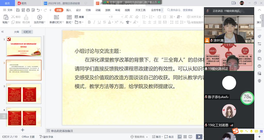 2022年3月31日下午,能源与化工学生第二党支部于腾讯会议开展了“深化课堂教学改革,提升课程思政质量”主题党日活动,会议由支部书记涂叶满主持。