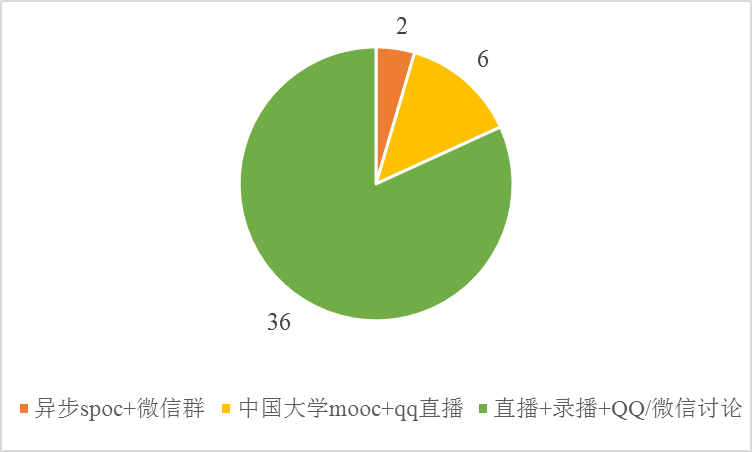 讨论等多样化的教学方式。据统计,36门课程采用直播+录播+QQ/微信讨论进行,6门采用中国大学mooc+qq直播,2门课程采用异步spoc+微信讨论,如下图2所示。从教师及学生反馈来看,目前所采用的在线教学方式均能被学生接受,特别是教学平台的线上视频资源+QQ/微信群讨论的方式更受学生欢迎,在线学习作业、测验布置方面及学习分析方面,教学平台具有明显优势,通过建立题库,不但简化了作业布置和批改,更便于成绩统计和分析。