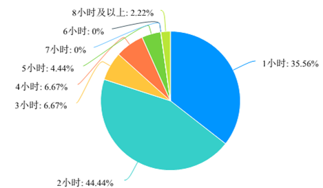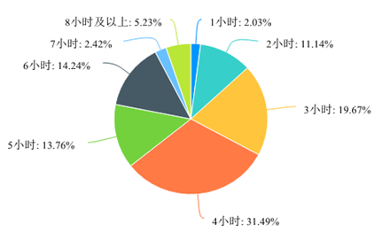 学生网络学习时间较长。如图3所示,80%左右的教师平均每天网络授课时间为1小时和2小时,授课超过5小时以上的较少。但对于学生每天网络学习时间(如图4),以3-6小时为主,且主要以电脑学习为主。从调查数据可看出学生每天网络学习时间较长,从收集上来的意见反映学生对于线上学习还未能完全的适应。