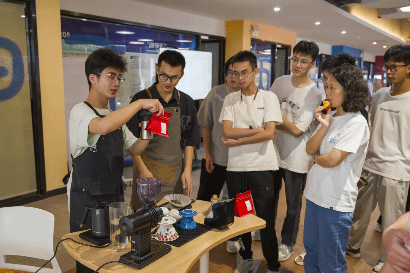 活动尾声,林志坚同学带领同学们参观了“不止咖啡”的吧台区域,介绍数字化运营理念及设备应用,并现场制作了一杯经典拿铁,引发了在场同学的浓厚兴趣。同学们踊跃提问,围绕品牌发展、市场定位、团队协作等话题与嘉宾展开热烈交流,气氛热烈而融洽。