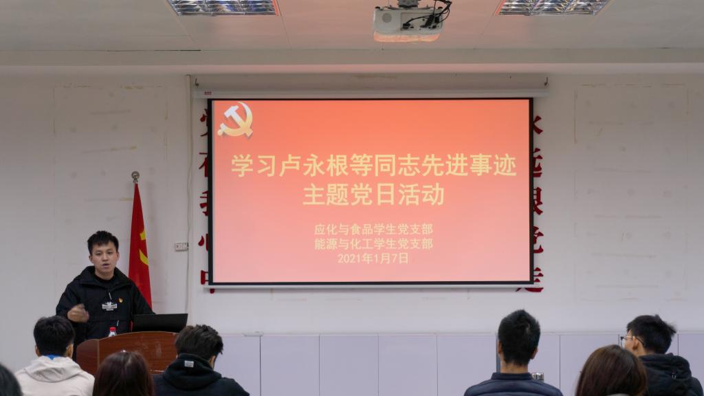 应化与食品学生党支部、能源与化工学生党支部联合开展“学习卢永根等同志先进事迹”主题党日活动。辅导员曾祥龙老师和支部党员参加此次活动,活动由应化与食品学生党支部书记张博主持。