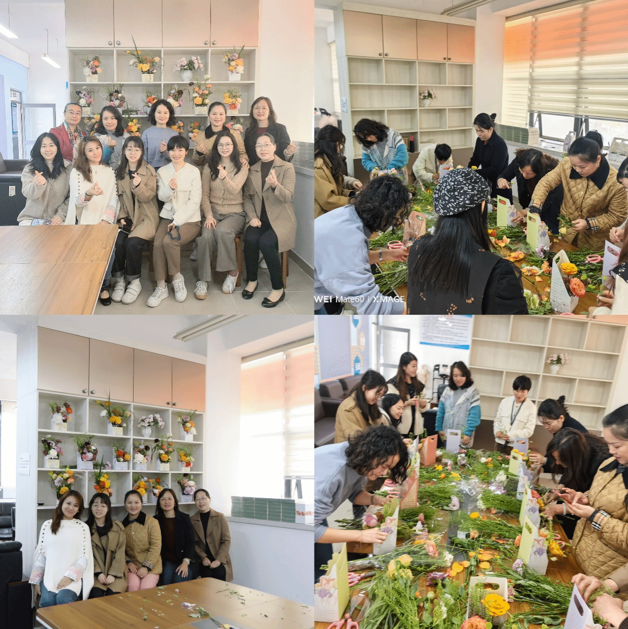 文化氛围,陶冶职工情操,本次活动为体验传统插花艺术,并邀请了专业花艺老师现场教学。女教职工们在花艺老师的带领下,结合各自手中的鲜花特点和审美情趣,一边交流一边实践,现场氛围轻松而愉快。