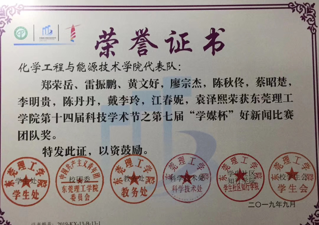 2019年在第十届科技学术节之第七届“学媒杯”好新闻比赛中,化能团学新闻网络部获得团队奖:其中《我校首次获批国家科技部“国际杰青计划”》(作者:郑荣岳、雷振鹏、黄文妤)《黑料吃瓜网 在校运会中勇夺佳绩》(作者:陈秋佟)两篇消息获得学校“好新闻”优秀消息新闻奖(文字类)。