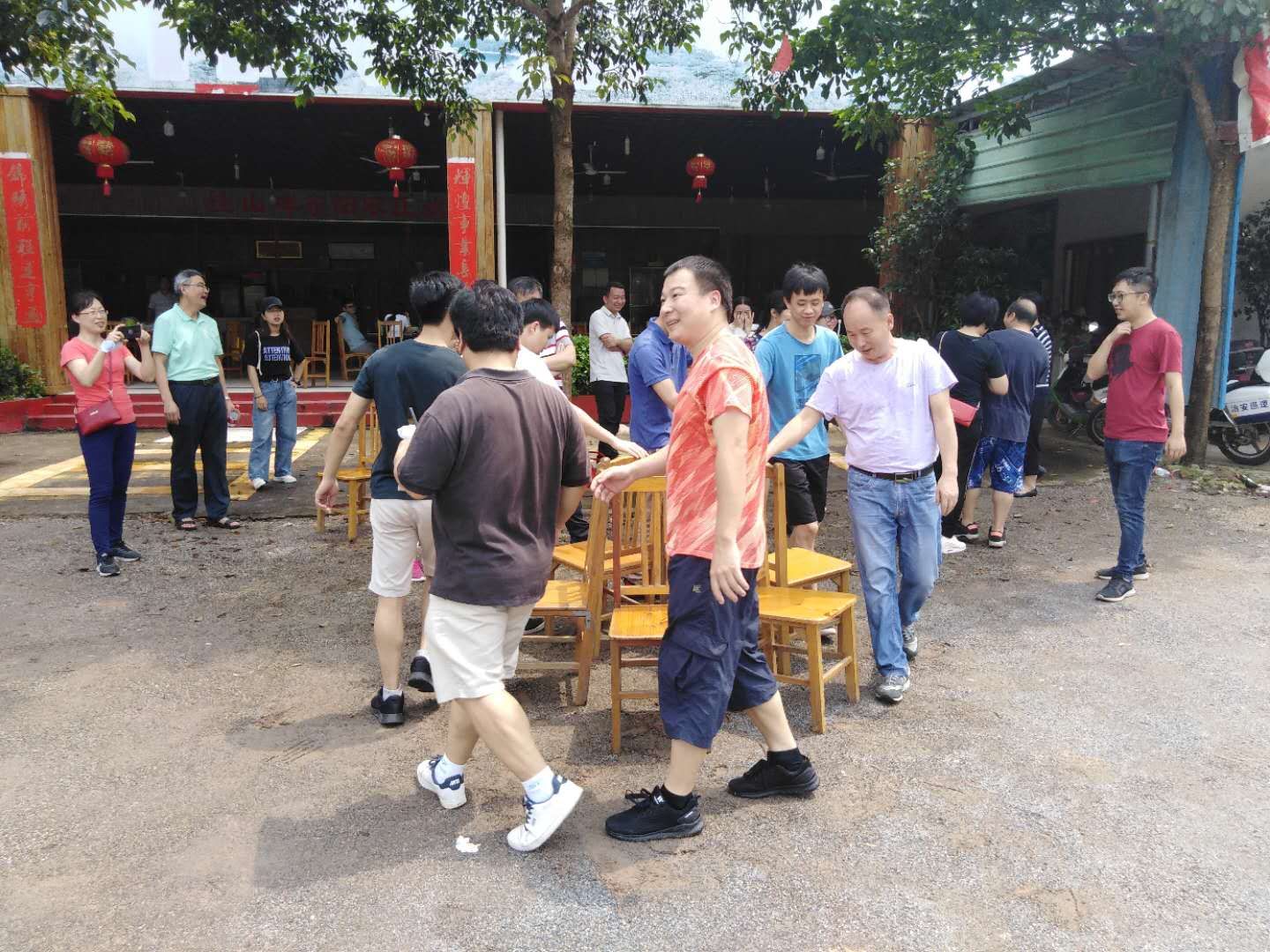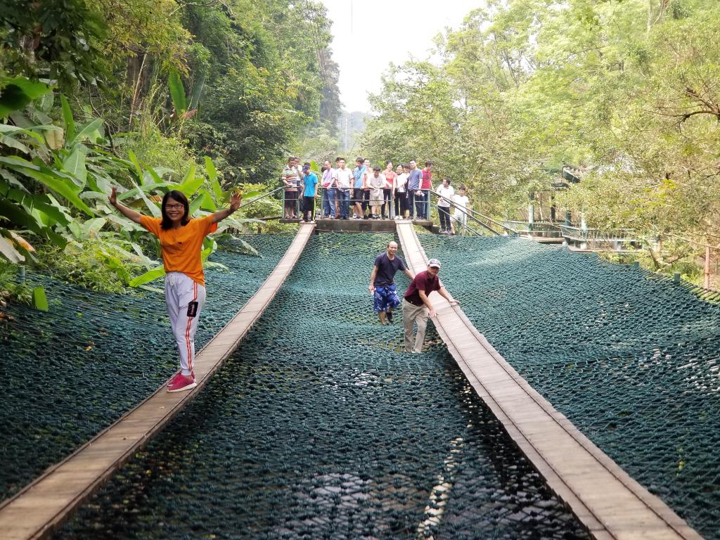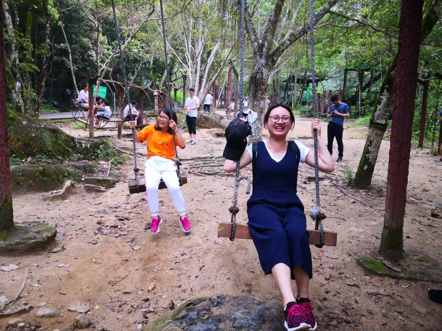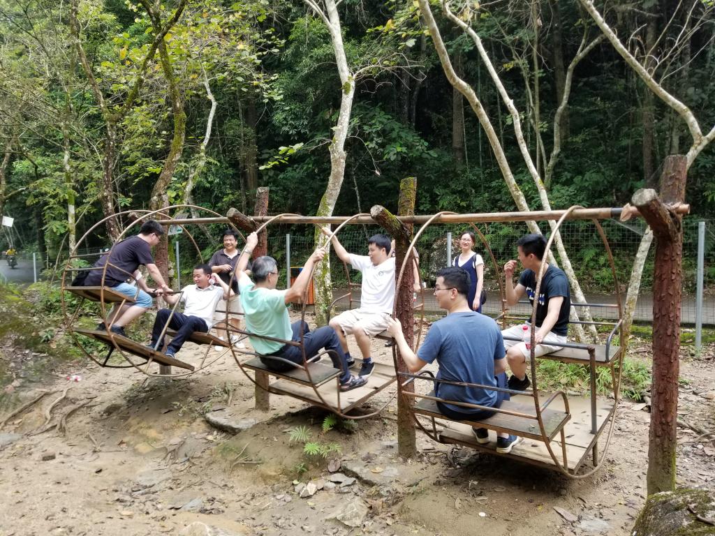 教职工们畅游十八里“花溪”,在生态文化体能娱乐区荡秋千、坐跷跷板、高空滑梯、抢夺“泸定桥”等多种运动及拓展项目,玩累了就躺在吊网床上休息。