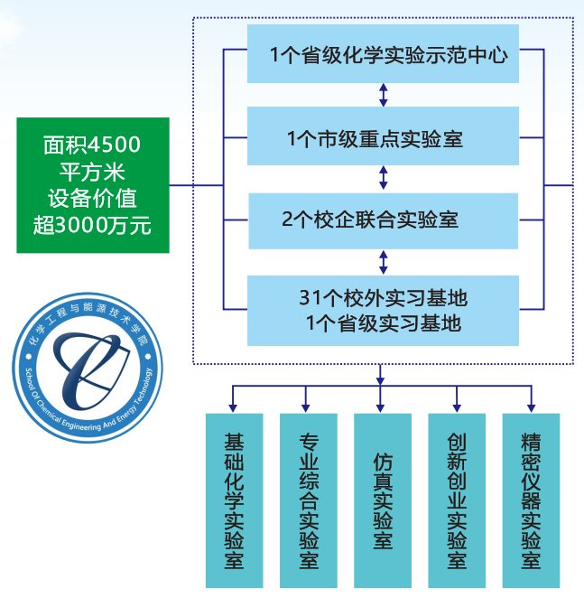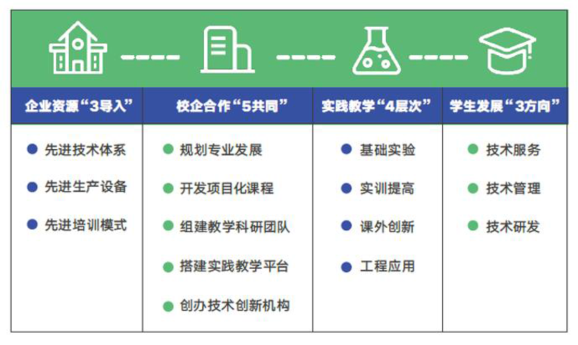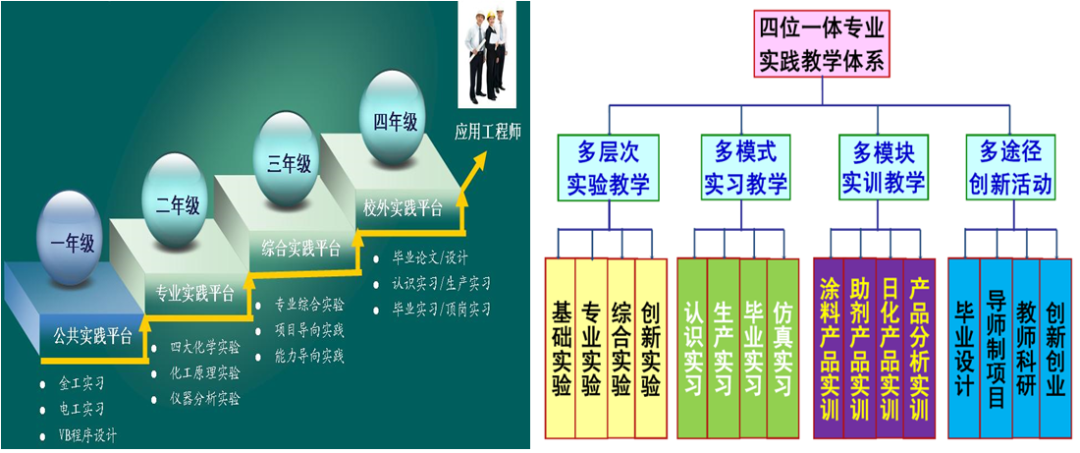 ,结合盛和化工、茂名石化、银禧科技等30多家校外实践基地群,实施企业资源“3导入”+校企合作“5共同”+实践教学“4层次”+学生发展“3方向”,形成完备的实践课程育人体系。