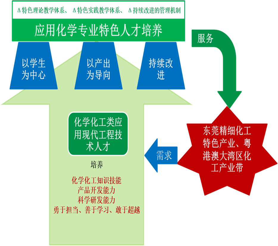 依据学校办学定位和人才培养总目标,坚持知行合一、立德树人,契合粤港澳大湾区化工产业集群及东莞地方经济发展需求,着力培养勇于担当、善于学习、敢于超越,能在化学及相关领域从事应用研究、技术开发、工艺优化、科学研究等工作的具有国际化视野和现代工程师素养的应用型创新人才。